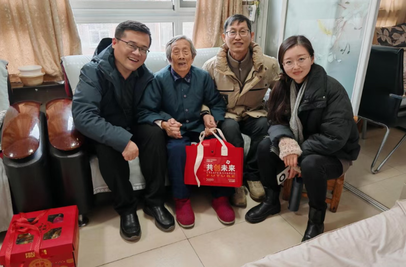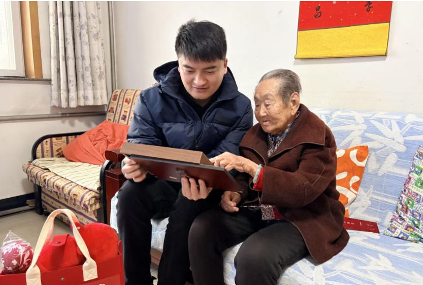 慰问小组每到一户,都与老前辈促膝长谈、嘘寒问暖,细致询问身体状况与日常起居,耐心倾听人生回忆与心声感悟,贴心叮嘱老人们保重身体、安享晚年。离退休处为老师们精心挑选了贴心实用的慰问品,颈椎保健枕、暖手宝、艾草锤、纯棉毛巾搭配印有“共创未来”的精美礼包,承载着对老同志们的美好祝愿。慰问小组率先来到了101岁的甘兰春老师和101岁的房秀英老师家中。甘老师拉着大家的手感慨:“现在日子越来越好,学校还总记挂着我们,心里特别踏实。”